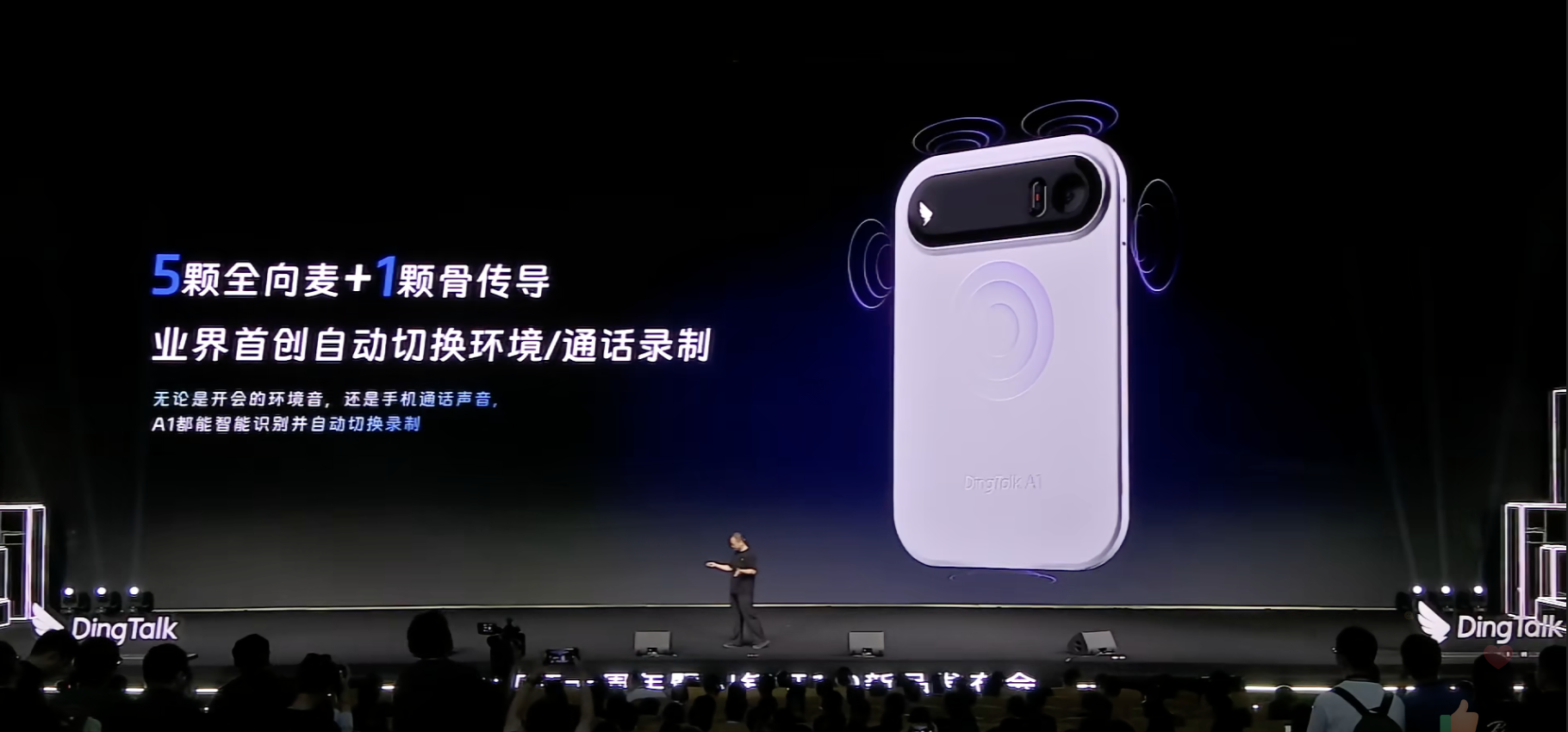 DingTalk A1采用5颗全向麦克风和一颗骨传导麦克风★ღ✿✿,业界首创自动切换环境/通话录制★ღ✿✿,支持在接听电话时切换到骨传导麦★ღ✿✿,在外放时切换5颗全向麦★ღ✿✿,支持连续45小时录音★ღ✿✿。