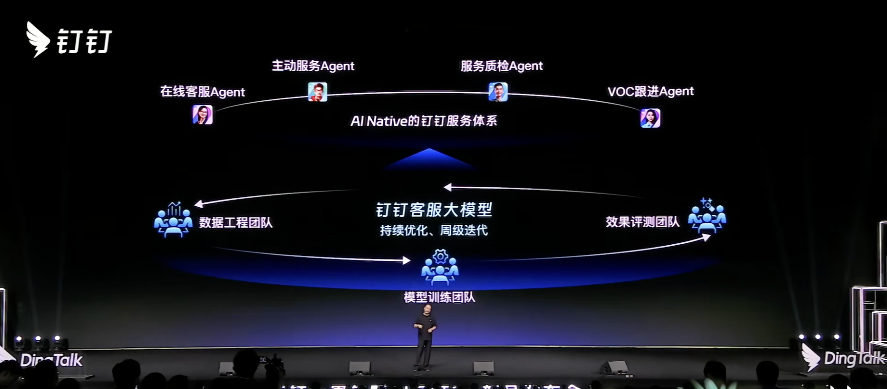 传统的客服系统是基于知识库提供问答服务★ღ✿✿,一般问答比较死板★ღ✿✿,满意度不高★ღ✿✿。钉钉AI客服团队实现了AI客服大模型训练★ღ✿✿,并用AI原生方式重建Agent服务★ღ✿✿,推出了在线客服Agent★ღ✿✿、主动服务Agent★ღ✿✿、服务质检Agent★ღ✿✿、VOC跟进Agent四个数字人助理★ღ✿✿,自动服务用户★ღ✿✿。